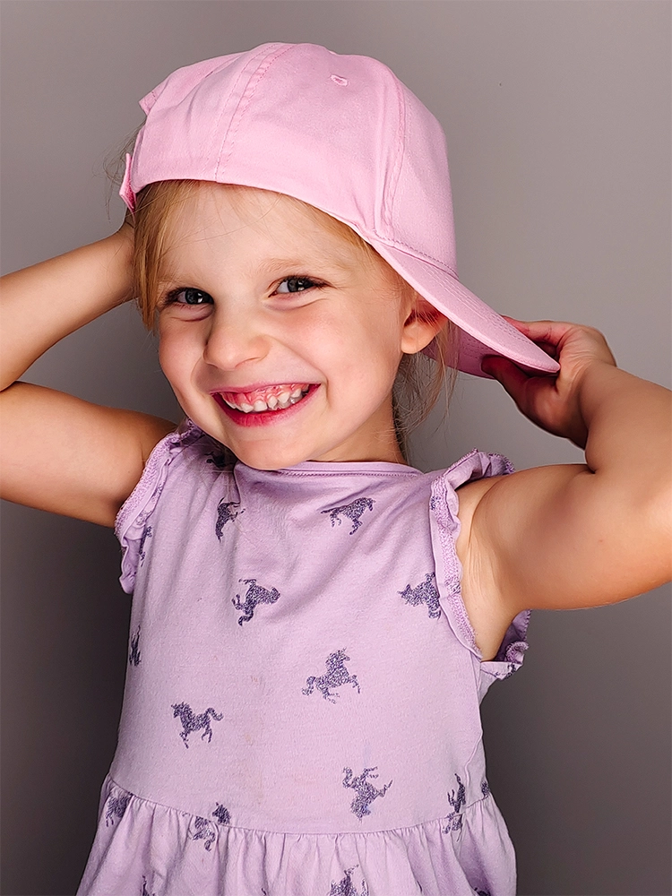 Posiada wstępnie profilowany daszek z czterema ozdobnymi przeszyciami, który chroni twarz dziecka przed promieniami słonecznymi,